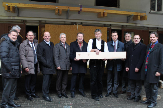 Bildbeschreibung: Minister Nils Schmid (vierter von rechts) zusammen mit Vertretern der Handwerkskammer, Firmeninhaber Sebastian Schmäh (mit Holzbalken), Bürgermeister Brütsch und SPD-Kreisvorsitzendem Dieter Stauber (rechts)