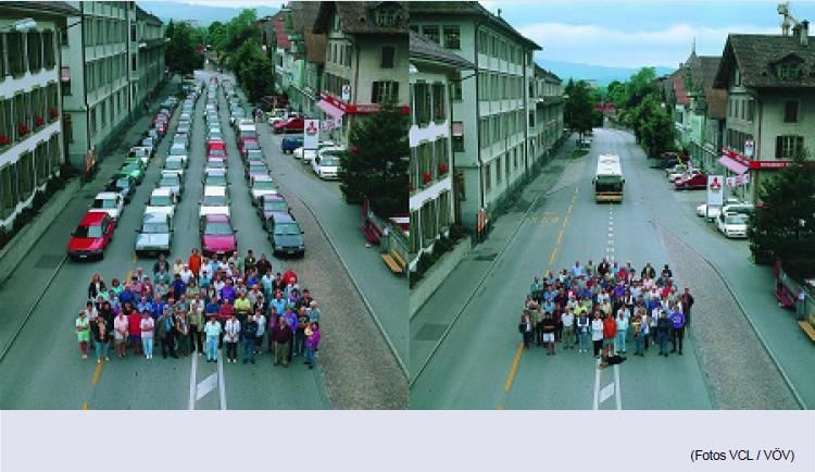 Wie viele Autos ein Bus ersetzt, zeigt Brigitte Haas (IHK Liechtenstein) mit diesen Fotos. LIHK, VCL